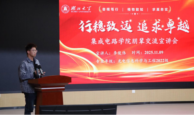 在经验分享环节,李俊伟等四位优秀推免生代表依次登台,围绕专业学习、科研竞赛、学生工作、志愿服务等方面,讲述了他们在集成电路领域的探索历程与成长感悟。四位同学均以专业排名第一的优异成绩推免至复旦大学、华中科技大学等知名高校并在SCI论文发表、国家级大创项目、全国性学科竞赛中取得突出成绩,展现了新时代集成电路学子的卓越风采。