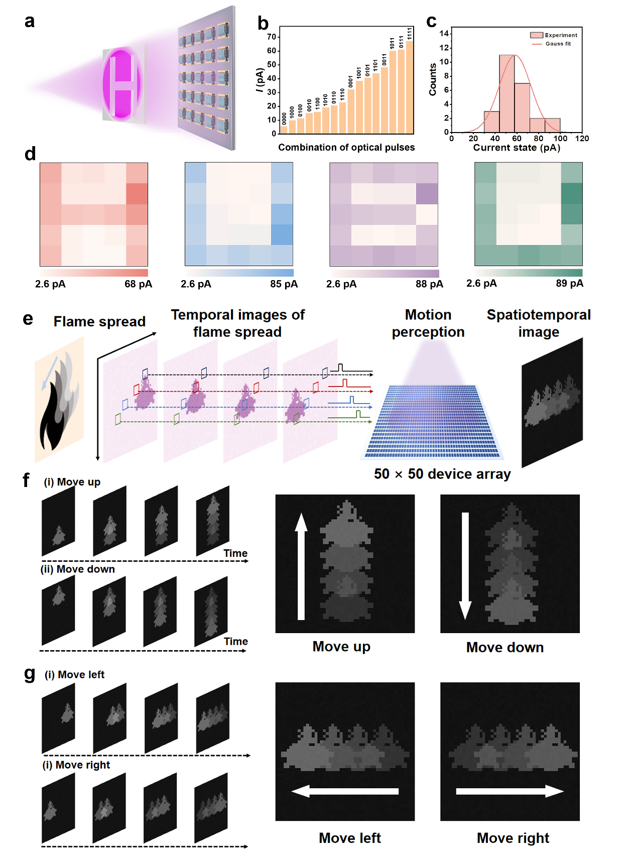 如图2所示,采用 255 nm日盲紫外光模拟极其微弱的火焰,在持续的光脉冲刺激下,Fe-OES表现出多级响应,并能够在终端有效地编码时间信息,实现潜在的火焰运动识别。受视觉系统启发,外部光刺激产生光生载流子的过程被用于模拟视网膜的光电导过程,进而通过模拟神经元突触来评估火焰传播趋势。