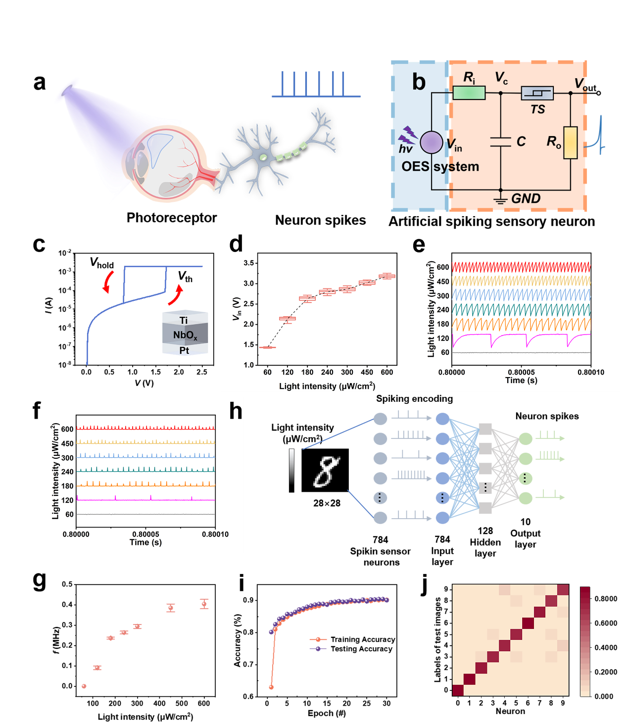 该研究还展示了一种基于Fe-OES器件的光敏人工神经系统,如图3所示,该系统通过神经元感知机制有效地探测火焰燃烧早期极其微弱的紫外光线,识别准确率达到了90.51%。