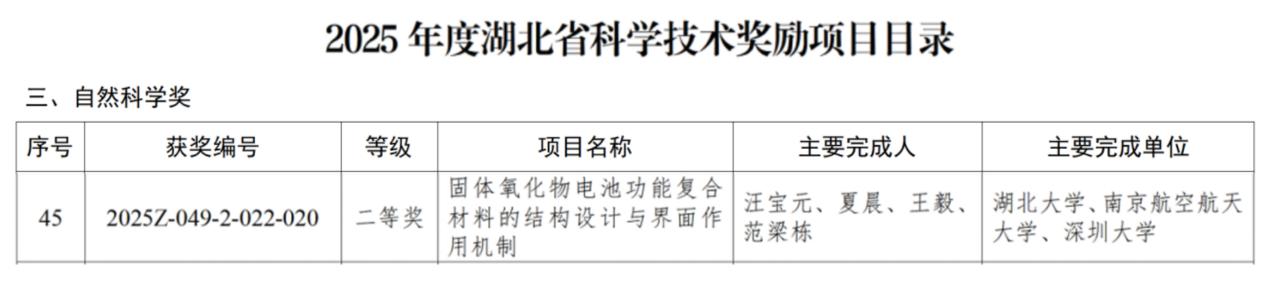 近日,湖北省人民政府在省科技创新大会上发布《湖北省人民政府关于2025年度湖北省科学技术奖励的决定》,威廉希尔WilliamHill官方网站汪宝元教授、夏晨副教授为主要完成人的项目《固体氧化物电池功能复合材料的结构设计与界面作用机制》获自然科学奖二等奖。